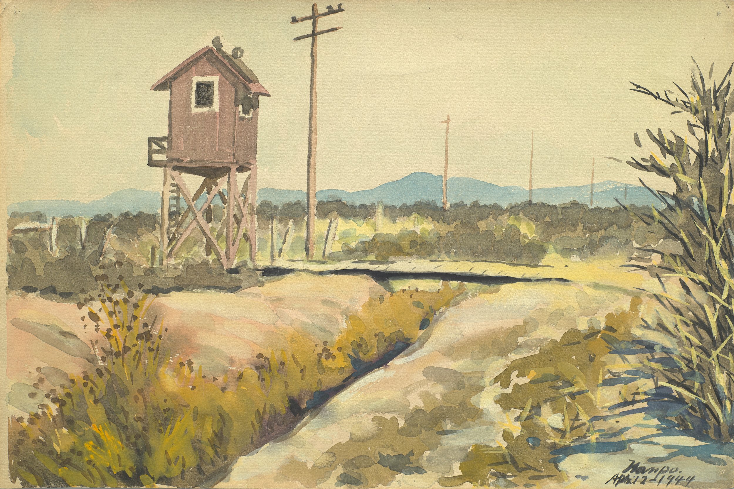 Image credit: Chikaji Kawakami, Untitled (The Guard Tower), 1944. Collection Monterey Museum of Art. Gift of the Jim and Diane Coward Family Trust. 2023.012.024